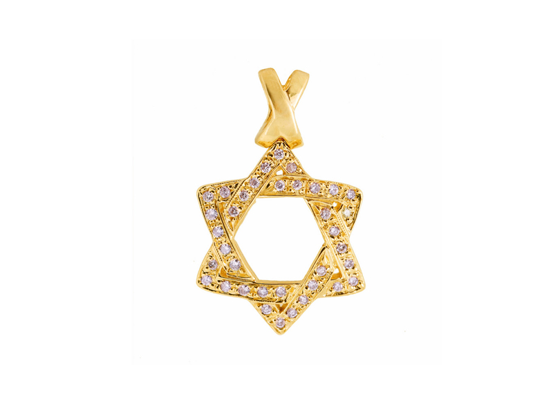 gold, pendant is shaped in a star of david and is encrusted with diamonds. The
