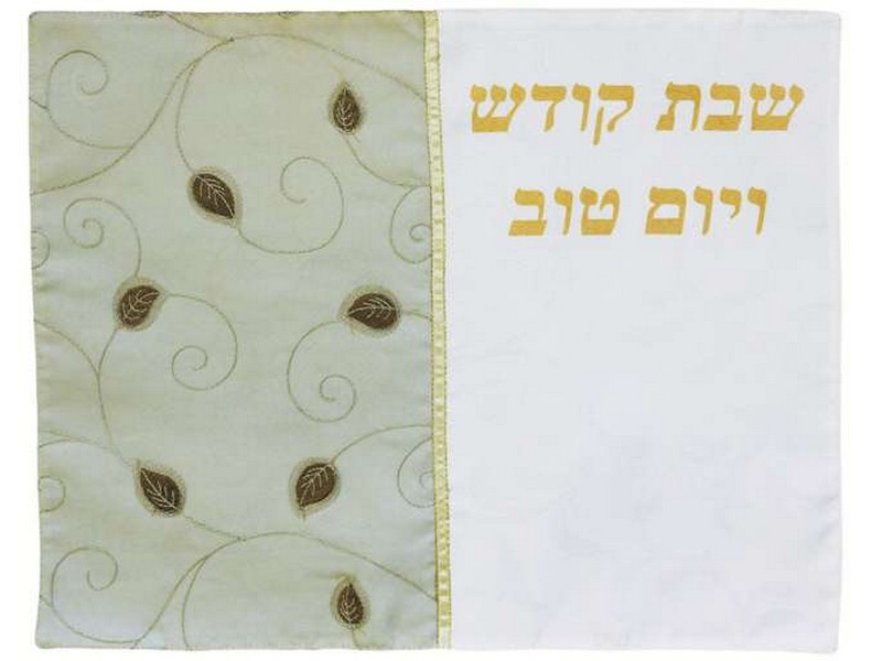 divided by a gold colored ribbon. The right half of the challah cover has the