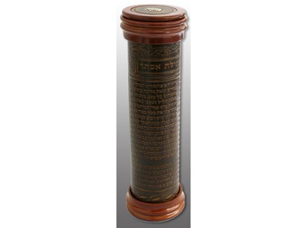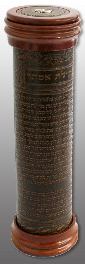 colored with a rich brown hue with the words of Megillas Esther embossed on the