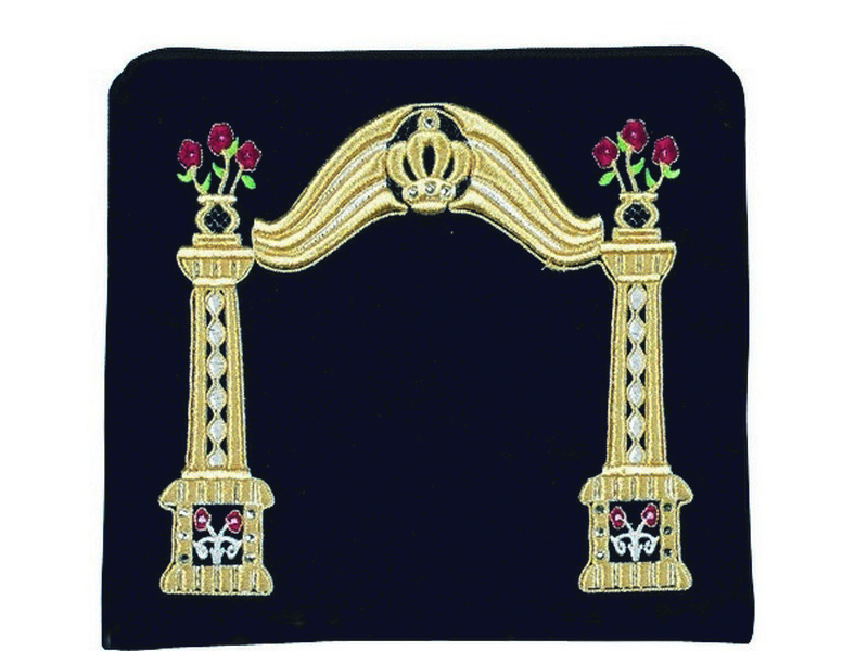 This velvet bag has an elegantly embroidered canopy with supporting pillars on each side. On the top of both pillars there are sets of flowers in a vase, matching the base of the pillars that boasts two flowers. In the center of the overhead canopy there is a crown that adds to the majestic theme.This design is available in either navy or black velvet,with a choice of the predominate color of embroidery being gold or silver. This bag is available as a tallit and tefillin set as well as separate Tallit and Tefillin sizes.This bag has the option of adding custom embroidery with Hebrew or English characters. An optional clear plastic slip-on protective bag is available for this bag.