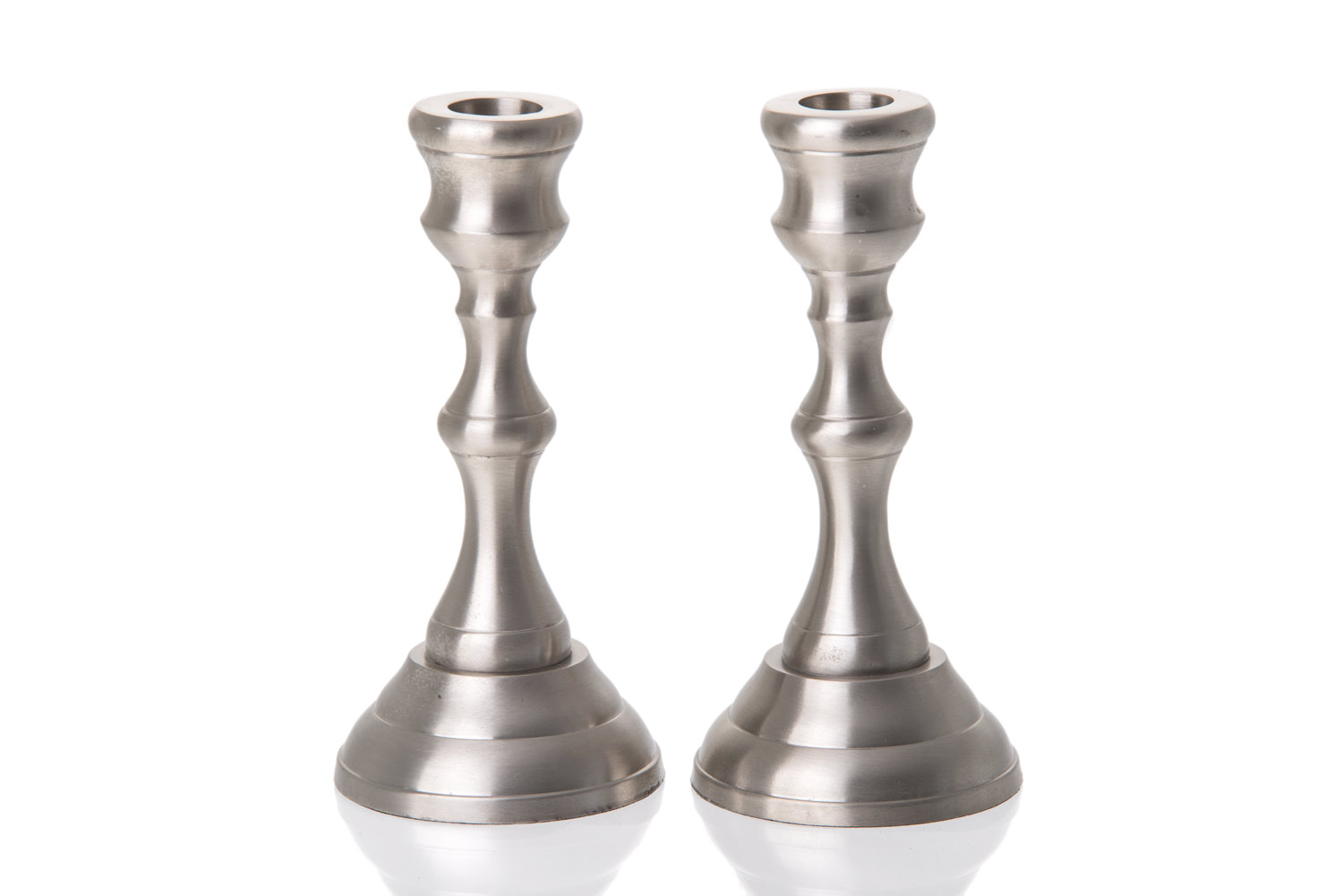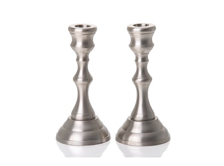 A contemporary looking set of candlesticks! Crafted from pewter, these candlesticks are short with a matte finish, round base and a modern shape. Sure to enhance your Shabbos table!