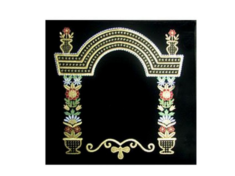 This velvet tallis/tefillin bag is beautifully designed. A rounded top canopy is threaded with gold and silver embroidery. The