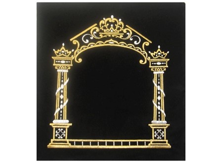 This velvet tallit/tefillin bag features an artfully embroidered canopy. Embroidered with gold and