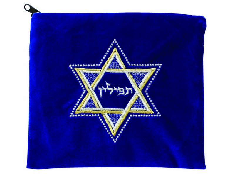 This royal blue colored velvet tallis/tefillin bag has one of Judaism’s most