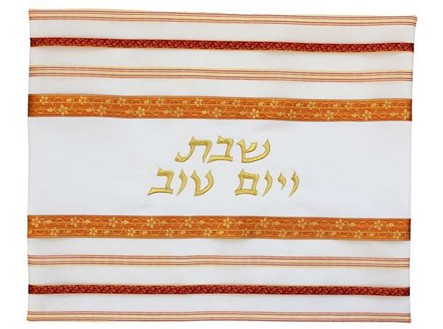 and Yom Tov”, embroidered in the center. The challah cover is decorated with a