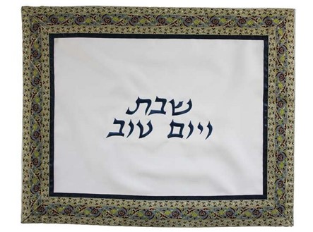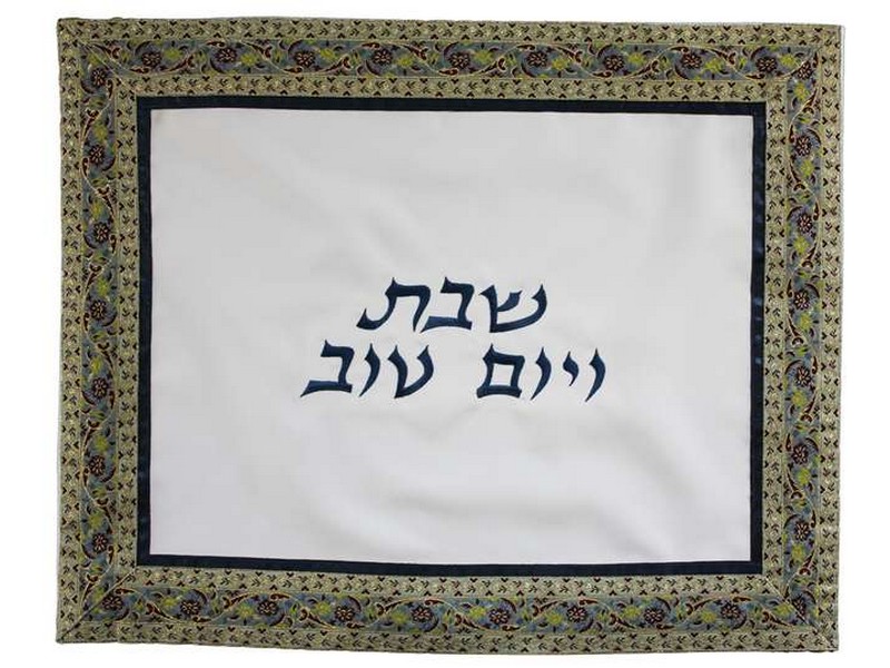 “Shabbat and Yom Tov”, embroidered in the center of the all-white background.