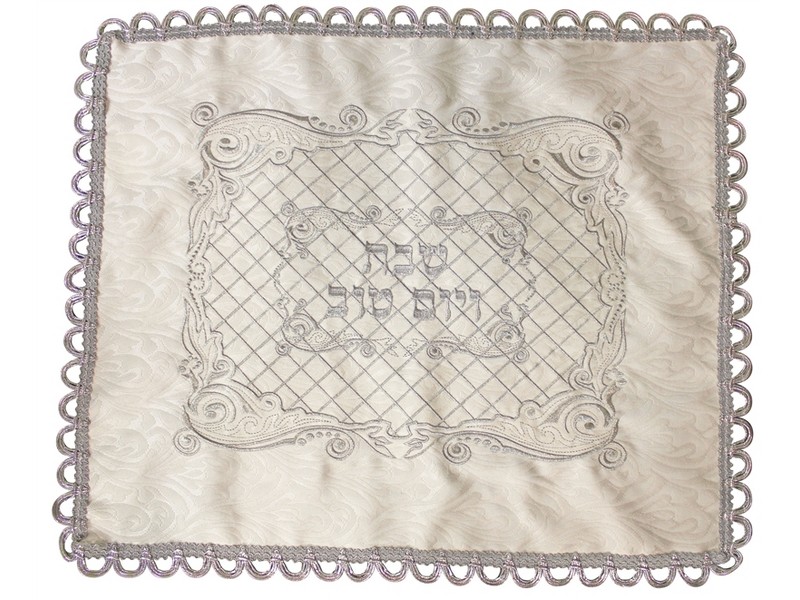 and Yom Tov”, embroidered in the center. A diagonal stitching in each