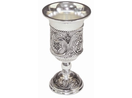 This Kiddush cup has a traditional and majestic look. A silver plated goblet with ornate flower