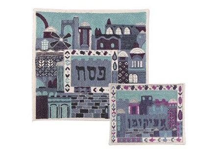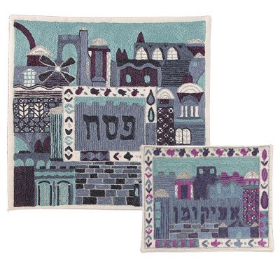 Embroidered Matzah Cover and Afikomen Bag - Jerusalem Blue