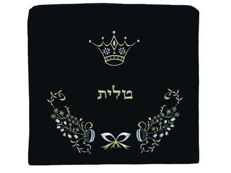 This velvet tallit/tefillin bag boasts a dainty and detailed design. An elegant bow is embroidered on the center bottom of the bag. Two bunches of twigs, leaves and flowers come out from each side of the bow in an upward direction. The Hebrew word “tallit” or “tefillin”, depending