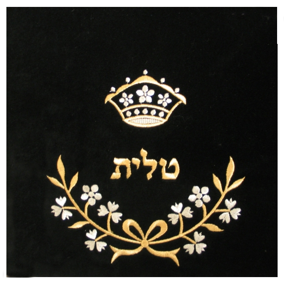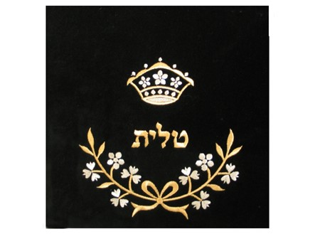 This velvet tallis/tefillin bag is embroidered with metallic gold and silver colored thread in a classy design. Branches full with flowers with a bow in its center form a semi-circle in an upward direction. Depending what size/style is selected, the Hebrew word “tallit” or “tefillin” is embroidered above the design. A crown adorns the top of the bag completing the regal look.