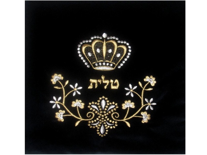 This velvet tallit/tefillin bag is designed with two toned flowers in metallic shades of gold and silver. The Hebrew word “tallit” or “tefillin”, depending on what size/style is selected, is embroidered in its center. A large, regal crown rests above the text.