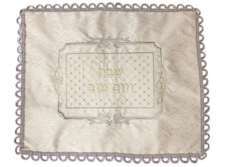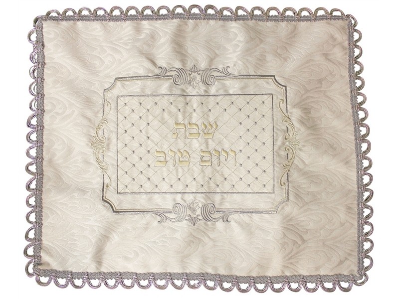 and Yom Tov”, is embroidered in the center. The edges are finished with silver