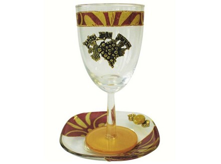 of the Kiddush goblet is gold colored glass and a plaque with grapes and the