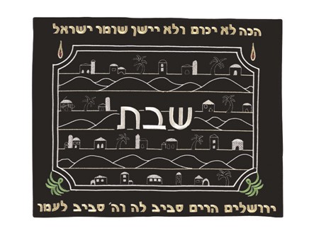 hills on multiple levels. The Hebrew word “Shabbat” is embroidered in the