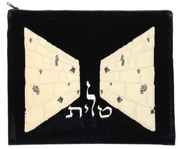 This velvet tallit bag has the one of Judaism’s holiest sites, The Western Wall, embroidered with creative and artistic expression. The
