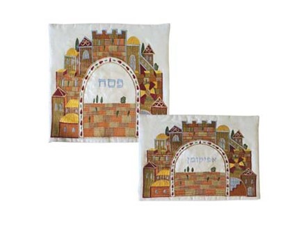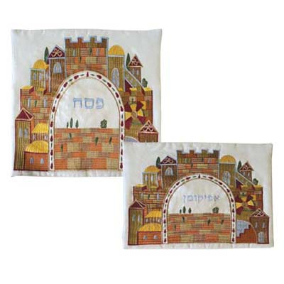 Raw Silk Embriodered Matzah Cover - Jerusalem Design