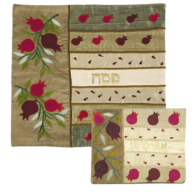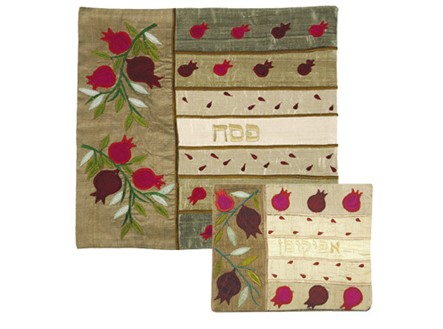 Raw Silk Embriodered Matzah Cover - Pomegranates Row Design