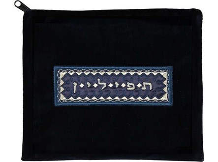 This navy colored velvet tallis/tefillin bag has a rectangle shaped box in