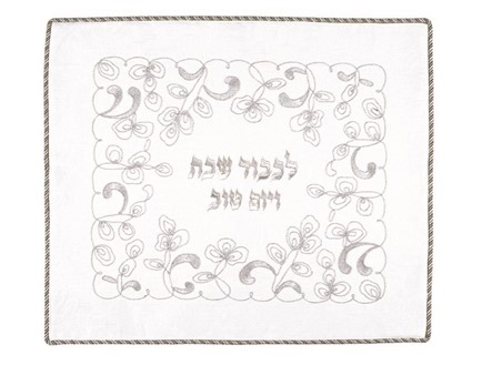 the challah cover is bordered by an elegant rope trimming.