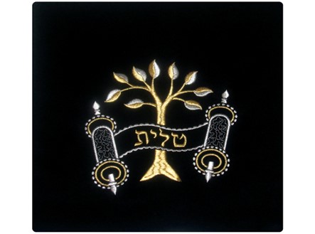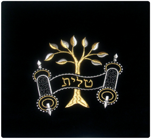 This velvet bag has the classic picture of the “Eitz Hachayim”, Tree of Life. A tree with multiple leafy branches lay in the background and a torah scroll is in the foreground. In the scroll, depending on the size/style selected; the Hebrew word “tallit” or “tefillin” is embroidered. This design is embroidered metallic gold and silver thread.